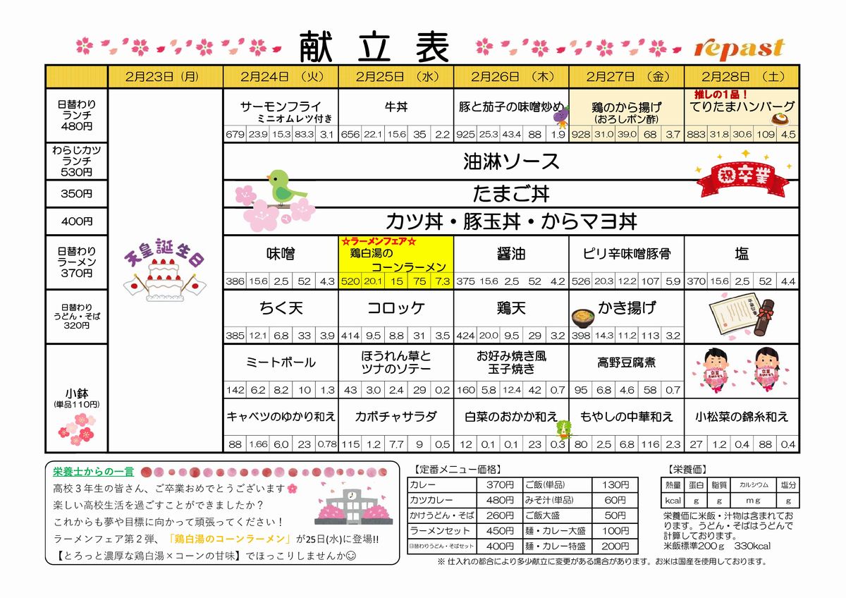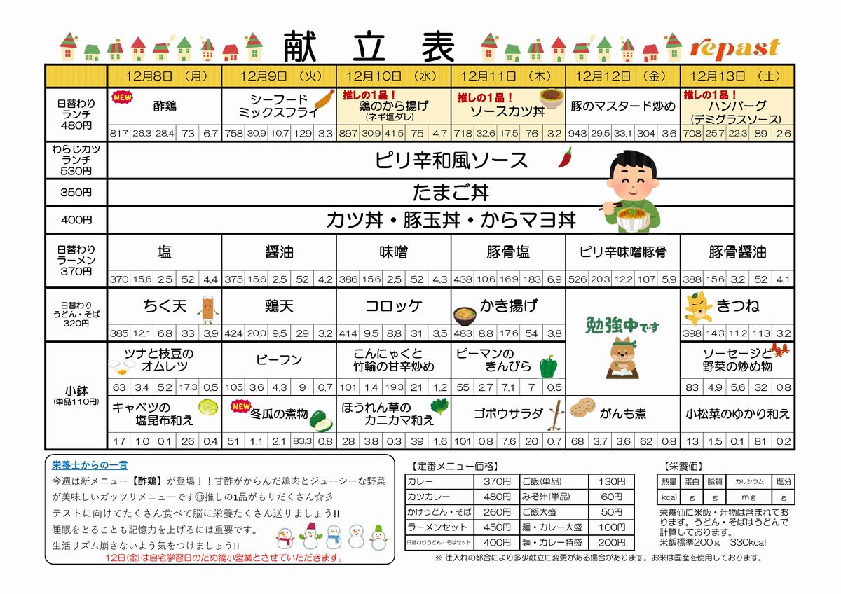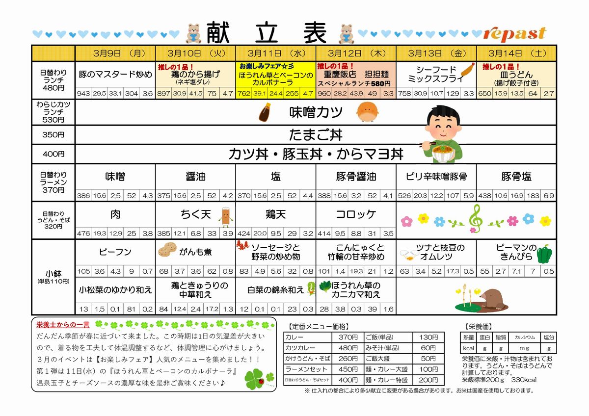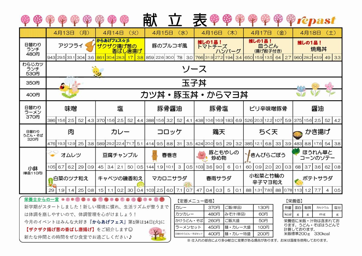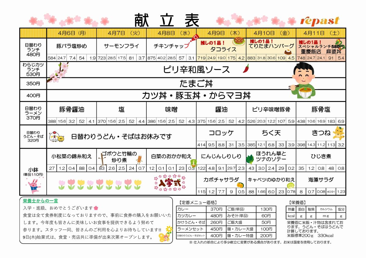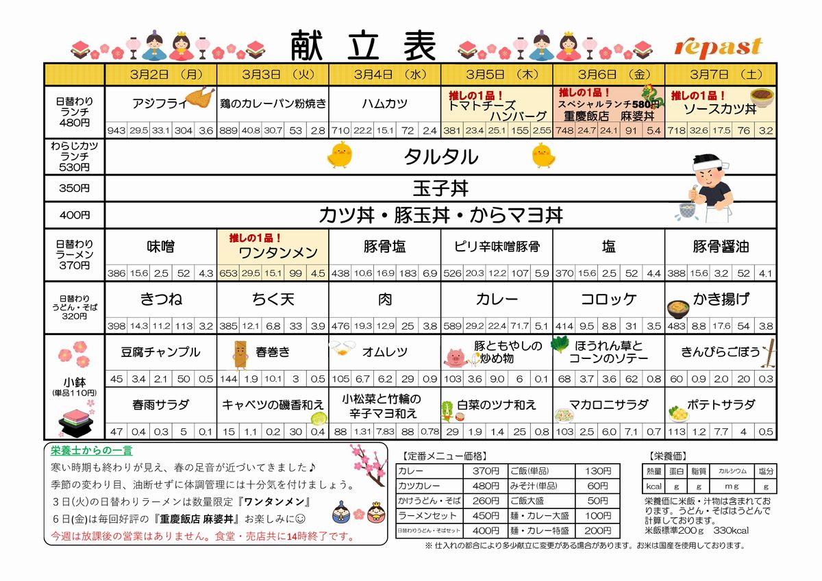 食堂紹介(週間献立表)