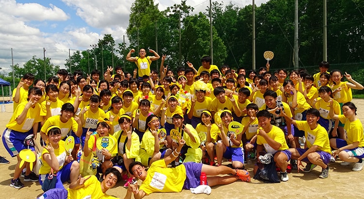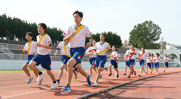 クラス対抗競技だけでなく、学年を飛び越えて、4つの縦割りチームでも競い合う体育祭。38人39脚など、ユニークでチームワークが大切な競技が盛りだくさんです。