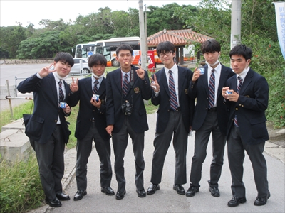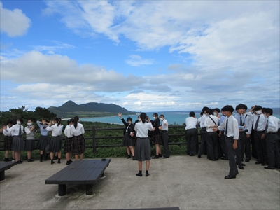 玉取崎展望台では,絵葉書になりそうな青い海の絶景をバックに,友人同士で写真撮影をしていました。その後,川平湾に移動。グラスボートに乗車し,クラス写真を撮影した後は,自由時間ということで,ブルーシールアイスクリームを食べたり,青い海を眺めたり初日から石垣を満喫していました。