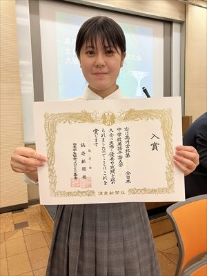 2023年9月19日(火)に開催された高円宮杯全日本中学英語弁論大会大阪府大会で本校中学2年生の光吉希望さんが入賞をしました。スピーチのタイトルは『Ending Hunger and Ensuring Education for All Children』( 飢餓の終結とすべての子供への教育保障実現へ向けて)でした。世界には学校に通うことができない多くの子どもたちがいること、そしてその大半が女の子であるという事実を伝え、その上で私たちには何ができるのかということを訴えました。夏休みの間に考えていたことを自分のことばで英語にまとめ、大会まで毎日練習を重ねてきました。「来年も挑戦をしたい!」と話してくれており、次年度の大会も楽しみです。