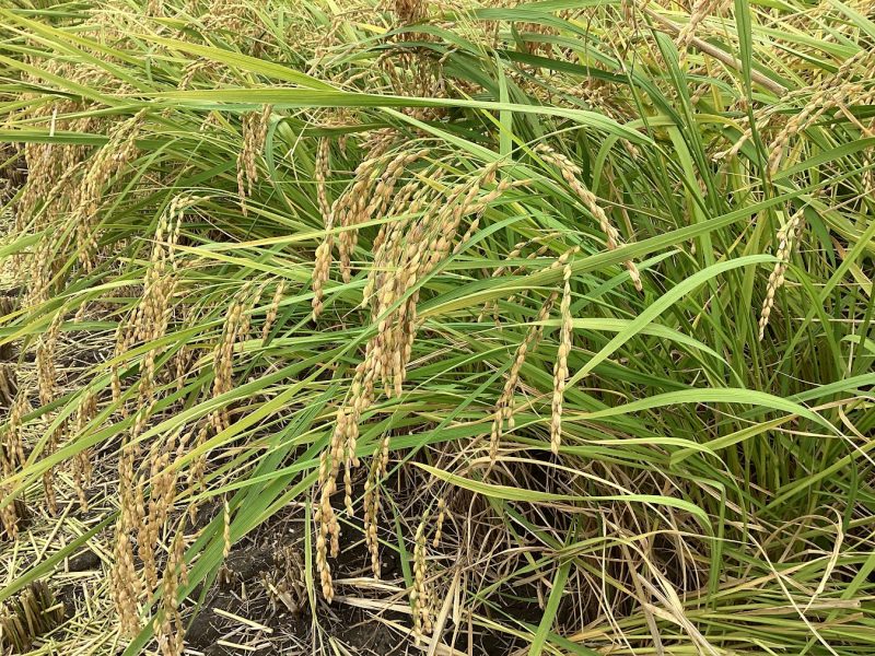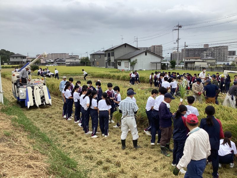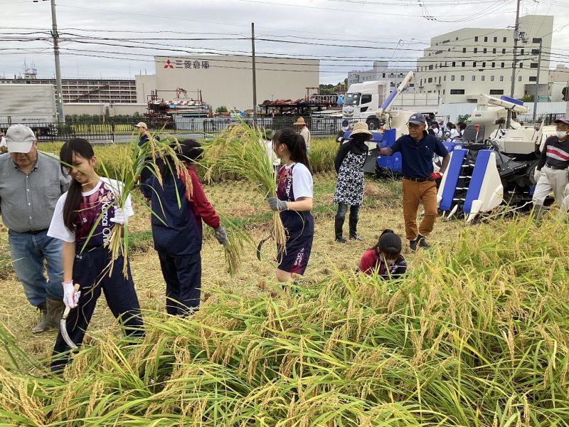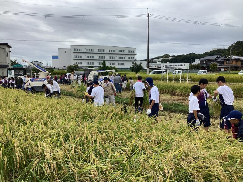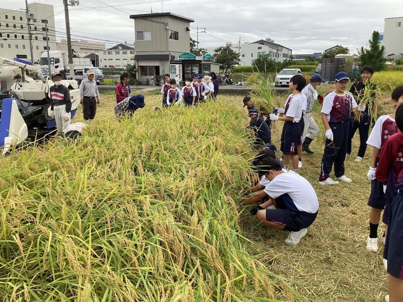 6月に中学1年生で田植えをした『倉の愛舞』の稲刈りを行いました。当初の予定より1週間遅い稲刈りとなりましたが、飛び跳ねるカエルに驚きながら、協力してきれいに刈ることができました。この後、乾燥・もみすりをして、生徒の皆さんにお渡しします。楽しみに待ってくださいね。