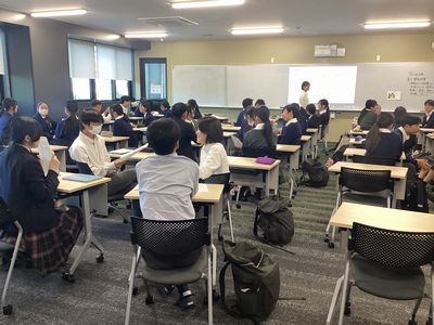 10月23日(木) 大阪大学外国語学部から矢元貴美准教授と学部生の2名が本校に来てくださり、「外国にルーツをもつ子供たち」について授業や体験談を話してくださいました。外国にルーツをもつ子供たちは、様々な理由で日本に滞在または住んでいること、その子供たちの教育や支援、現状、地域格差などについて授業をしてくださいました。生徒たちにフィリピン語のワークシートを配布し、フィリピン語で授業をするという体験もさせてもらいました。生徒たちからは「言葉がわからないって悲しい」「先生が何を言われているのか理解できない」「なんとか理解しようとしたが難しい」などのコメントがありました。さらに矢元准教授から、「今は、周りのみんなも言葉がわからない状態ですよね。もし、これがあなた一人しか言葉がわからない状況で授業をうけていたとしたら、どう?」と投げかけられ、生徒たちは静まり返っていました。また、学部生であり、本校卒業生は、外国にルーツがあるご自身の体験談を話してくださいました。「言葉の壁」「心の壁」「制度の壁」の3つの壁を感じてきたという体験談には、生徒たちも熱心に聞き入っていました。本当に貴重なお時間をありがとうございました。