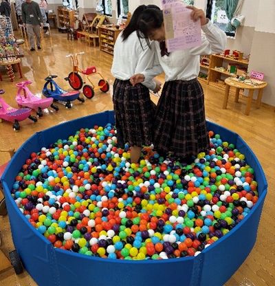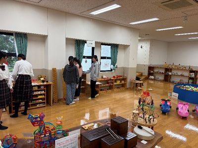 「おもちゃとえほんのへや」には、発達段階に合わせて工夫された知育玩具のほか、約12,000冊の絵本や約1,500種類の紙芝居が整然と並び、温かく落ち着いた雰囲気の中で、子どもが遊びながら学べる空間が広がっていました。職員の方からは、教育学部の学生が授業や実習の中でこの部屋をどのように活用しているかについても説明を受け、生徒たちは興味深く耳を傾けていました。また、生徒たちは、子どもの発達を促す知育玩具に直接触れ、遊びを通して学ぶ教育の工夫を体験することができました。