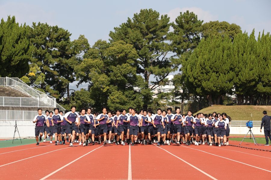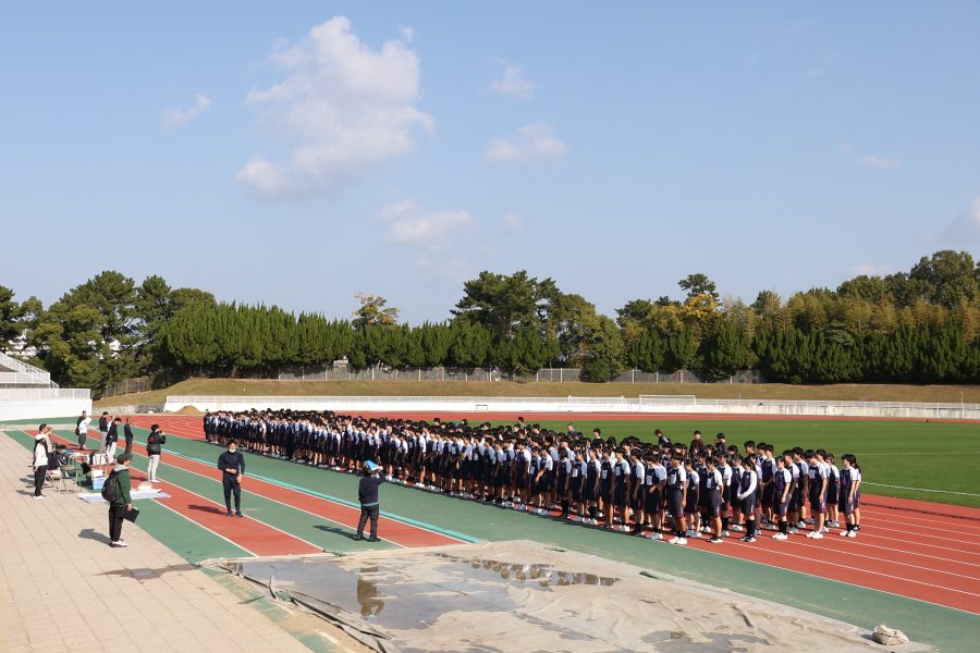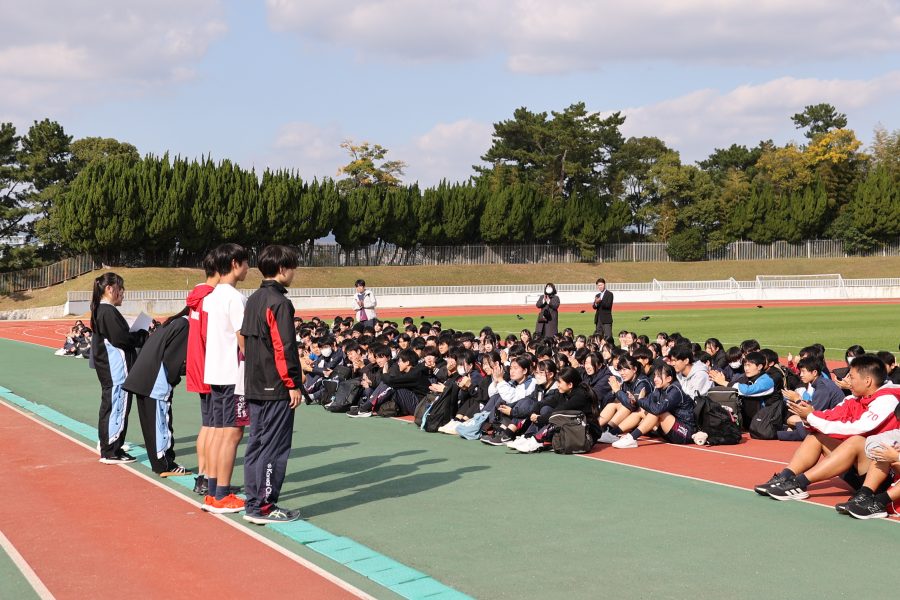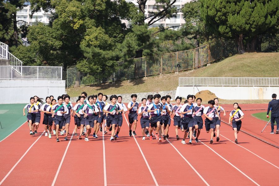 高1学年では、服部緑地公園において、ロードレース大会を開催いたしました。マラソンと駅伝の2つの部に分かれて、全員が走りました。