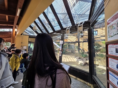 日中は暖かな陽気であったこともあり、動物園は家族連れで大賑わいです。特に人気者のゴリラは来園者が多く集まり、観察も少し大変そうでした。