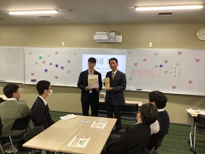 1時間目はウェルカムセレモニーを行いました。本校校長、代表生徒、そして龍山(ヨンサン)鉄道高等学校の先生が、それぞれの言語で歓迎と感謝の気持ちを伝え合い、温かい雰囲気の中で交流がスタートしました。その後は、生徒同士で自己紹介をしたり、お互いの文化について紹介し合ったりと、笑顔の絶えない時間となりました。