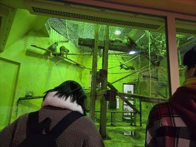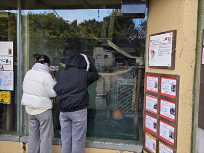 今シーズン最強寒波とニュースで言われている日、朝から京都市動物園でフサオマキザルとアカゲザルの観察が続きます。寒くて凍えながらも、少しの休憩時間には熱帯館に入って暖をとり、温かい飲み物で一時だけ体を温め、夕方まで行いました。時折、雪やあられが強く降り、強風で逃げ場もなく凍える中での厳しい環境でしたが、寒い時にはその状況に応じた行動も観察できます。フサオマキザルやアカゲザルたちは身を寄せ合って団子になって暖をとっていました。