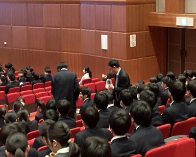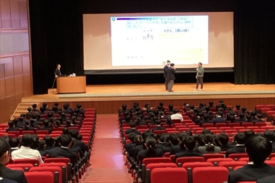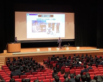 1月22日(木)6限目、ハイブリッドホールにおいて、大阪税関総務部税関広報広聴室の皆様にお越しいただき、不正薬物の恐ろしさ、税関業務、麻薬探知犬の仕事内容について、お話しいただきました。違法薬物の誘いを断る練習を本校生徒会役員と先生がロールプレイ形式で実施しました。次に税関の仕事については、クイズ形式により皆で考えました。さらに、麻薬探知犬のデモンストレーションも見せていただきました。生徒の皆さんには、今回の講演会をきっかけに、違法薬物の恐ろしさを忘れずに、絶対に関わらないでいただきたいと思います。