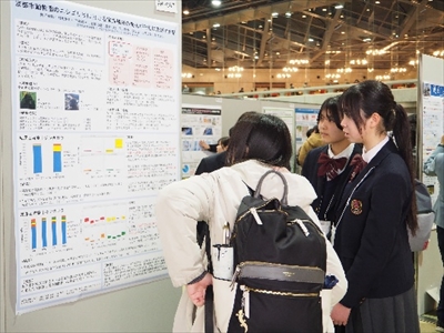 いよいよ準備を重ねてきたポスター発表の日となりました。朝から緊張の表情で会場に入り、たくさんのポスターが並ぶ会場で11時からコアタイムが始まりました。会場には高校生のポスターだけでなく、一般の研究者のポスターも並び、中には受賞ポスターも見ることができ研究者の方々から直にお話を伺うことができました。30分毎の時間入れ替えで奇数偶数番号の発表を2回転行いました。2時間立ちっぱなし、話しっぱなしでかなり疲れたことと思います。聞きに来てくださった研究者の方を前に約5分の発表を繰り返して、そのあと質疑応答となりますが、なかなか鋭い指摘や、難しい質問に焦る生徒の表情。すごい経験をさせてもらっています。学会準備までサポートしてくださったアドバイザーの方々、大学の先生方には感謝の思いでいっぱいです。今回の発表を通じて今後の課題やブラッシュアップしていくべき研究内容を整理できたことと思います。
