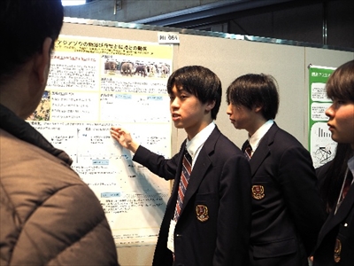 いよいよ準備を重ねてきたポスター発表の日となりました。朝から緊張の表情で会場に入り、たくさんのポスターが並ぶ会場で11時からコアタイムが始まりました。会場には高校生のポスターだけでなく、一般の研究者のポスターも並び、中には受賞ポスターも見ることができ研究者の方々から直にお話を伺うことができました。30分毎の時間入れ替えで奇数偶数番号の発表を2回転行いました。2時間立ちっぱなし、話しっぱなしでかなり疲れたことと思います。聞きに来てくださった研究者の方を前に約5分の発表を繰り返して、そのあと質疑応答となりますが、なかなか鋭い指摘や、難しい質問に焦る生徒の表情。すごい経験をさせてもらっています。学会準備までサポートしてくださったアドバイザーの方々、大学の先生方には感謝の思いでいっぱいです。今回の発表を通じて今後の課題やブラッシュアップしていくべき研究内容を整理できたことと思います。